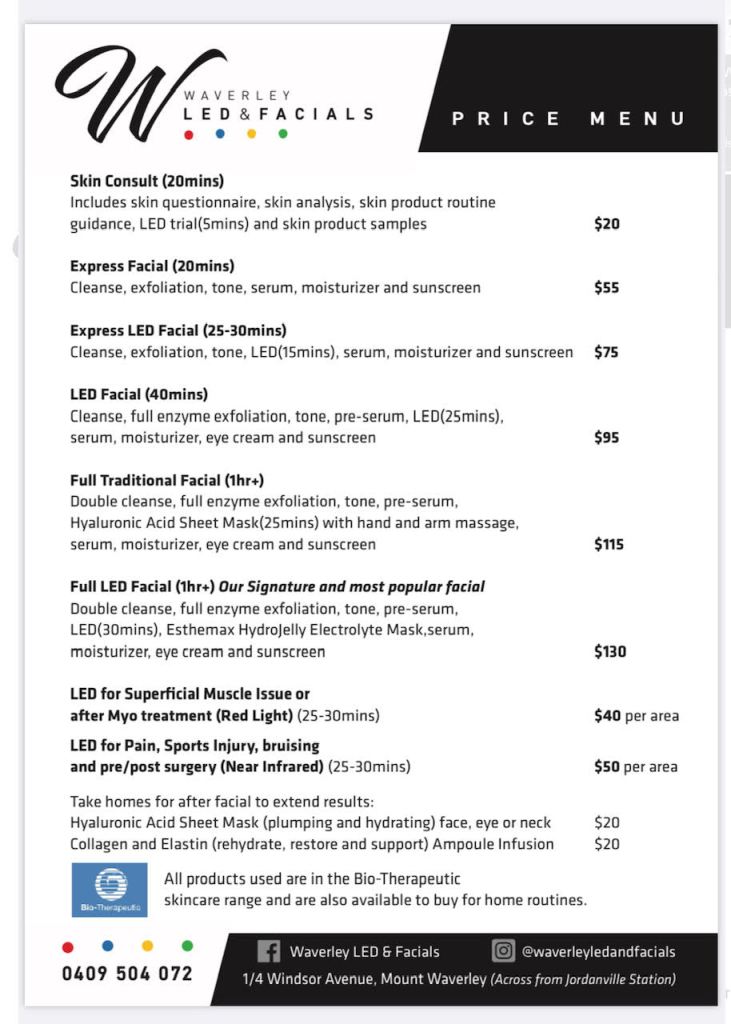 Whether it’s a relaxing facial, a skin repair need or a pain reduction LED you’re after, David from Waverley LED and facials has you covered! Click here to find a time that suits you best!